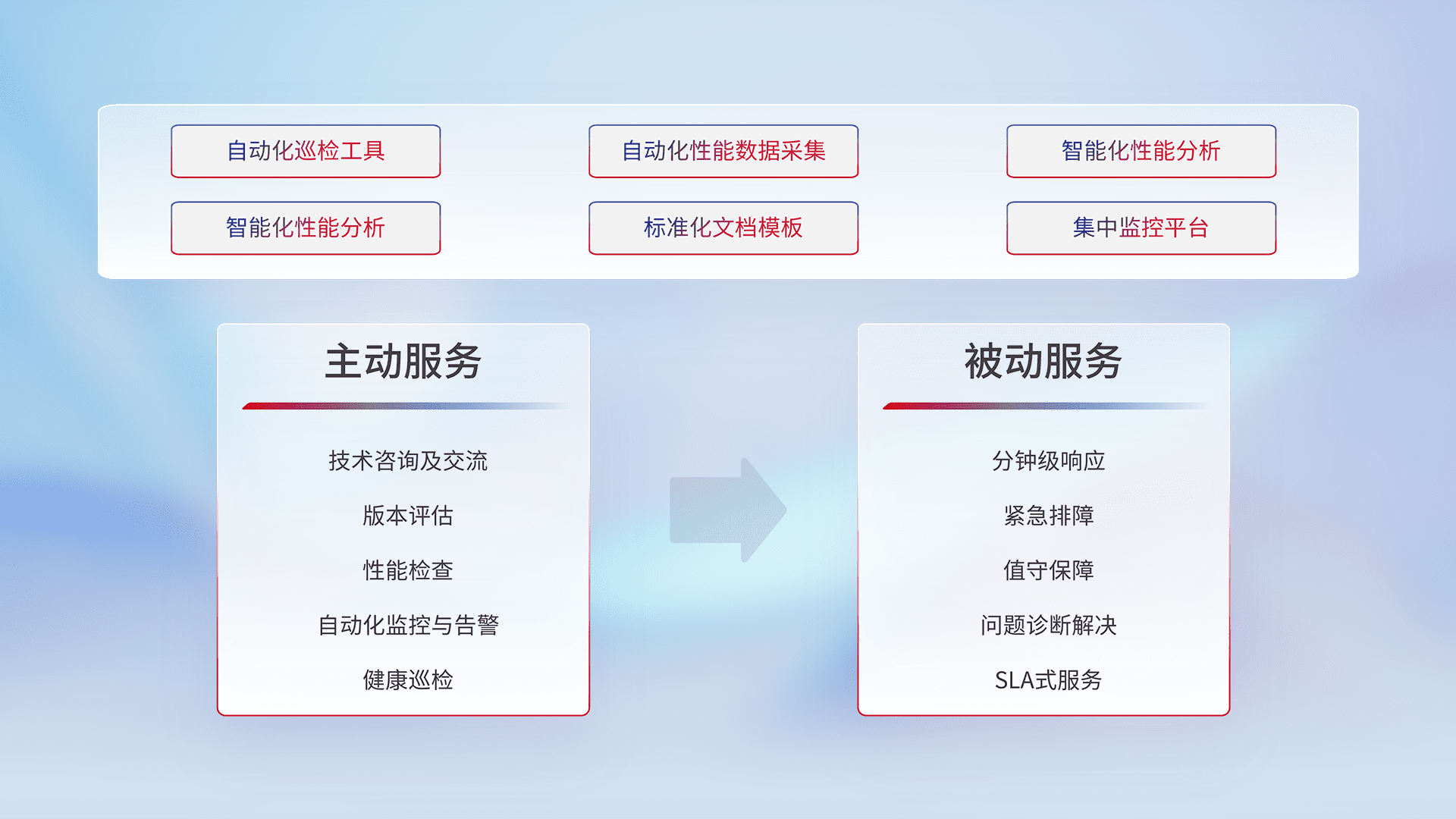 智能化工具和标准化文档,,,,保障服务质量,,,提供主动服务(包含技术咨询、、、版本评估、、性能检查、、、自动化监控与告警、、、、健康巡检)和被动服务包含(分钟级响应、、、、紧急排障、、、、值守保障、、问题诊断解决、、SLA服务)。。